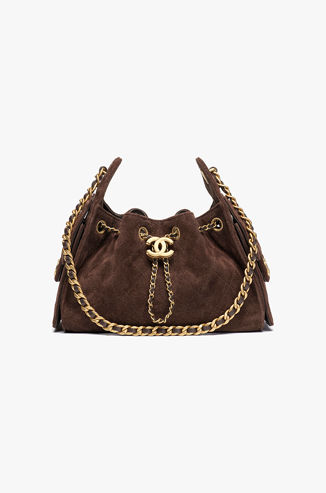 The Cacao Cabas Drawstring Mini embodies understated opulence — a rich, sculptural accessory crafted from deep chocolate suede, quilted with Chanel’s iconic diamond patterning. This silhouette merges the softness of suede with couture architecture, creating a mini that feels both indulgent and effortlessly Parisian.
