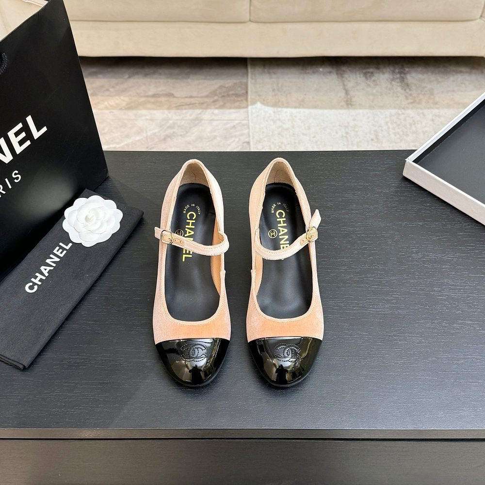 The Lumière Éclat Mary Jane Heels by Chanel embody timeless Parisian elegance infused with modern opulence. Crafted in a soft nude velvet finish, this silhouette is elevated by a signature black patent cap toe—an iconic Chanel contrast that defines sophistication.