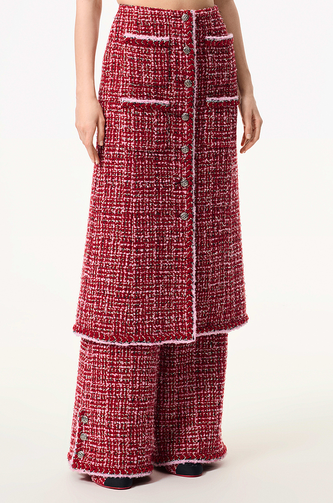 An emblem of Parisian haute couture, the Chanel Rouge Atelier Ensemble redefines classic elegance with a modern architectural twist. Crafted from luxurious handwoven red and blush tweed, each piece in this runway look embodies Chanel’s meticulous craftsmanship and sculptural tailoring.