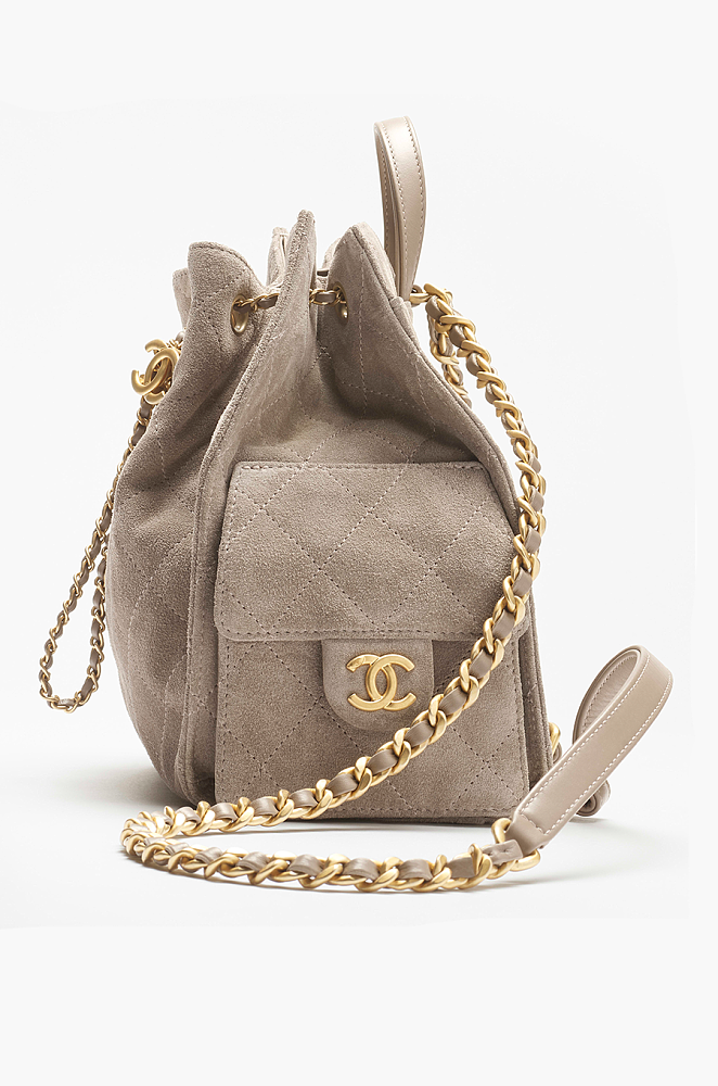 The drawstring silhouette merges vintage Parisian charm with modern utility — elegant enough for soirées, yet effortlessly versatile for everyday refinement. The gold CC turn-lock and side pocket detailing evoke the timeless spirit of Chanel, celebrating both luxury and practicality in one statement piece.