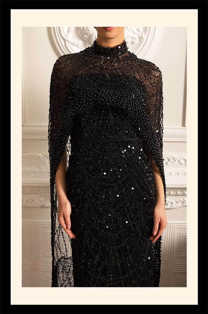The gown’s sculpted form is complemented by a sheer beaded cape overlay that cascades with architectural precision, enveloping the wearer in a halo of opulence. From the high neckline to the sweeping hemline, this piece channels cinematic drama and haute refinement — designed for grand entrances, red carpets, and couture showcases.