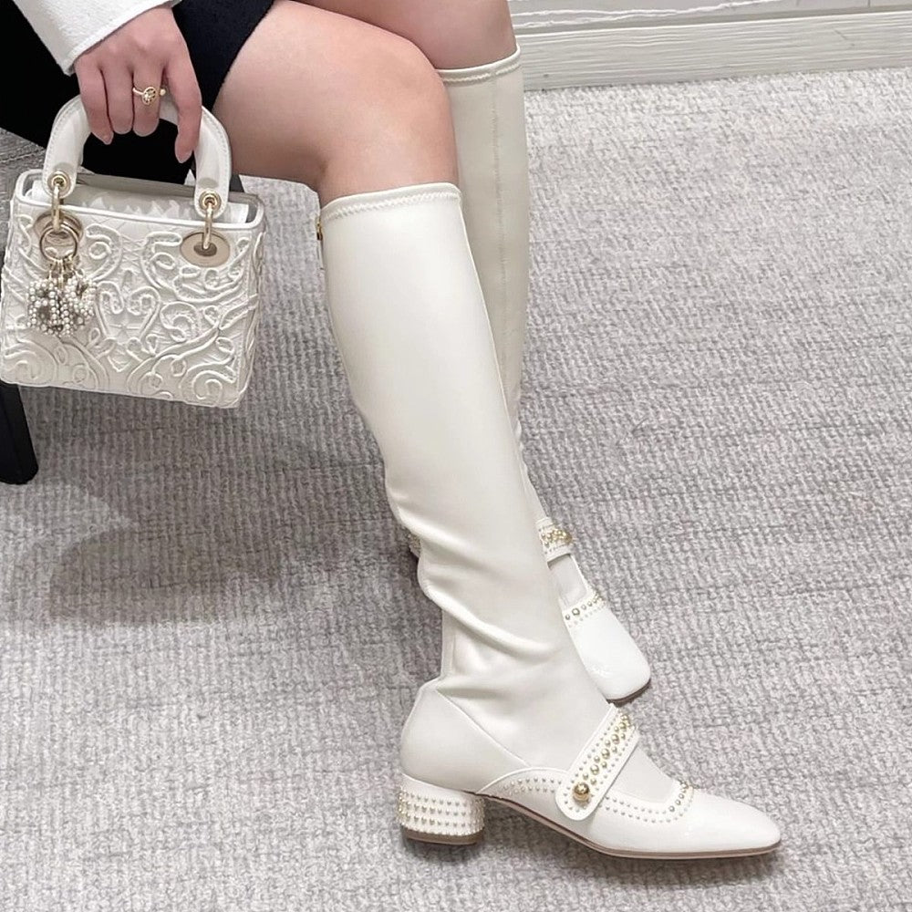 The Clarette d’Or Haute boots reinterpret timeless sophistication with statuesque poise. Designed in lustrous ivory leather and crowned with gold micro-studs, this knee-high silhouette elongates the leg while maintaining the signature studded strap and sculptural block heel of the original Clarette d’Or. A fusion of classic refinement and modern grandeur, these boots whisper luxury with each step—perfectly paired with winter coats, structured mini skirts, or tailored ensembles from the Velour de Luxe collection.