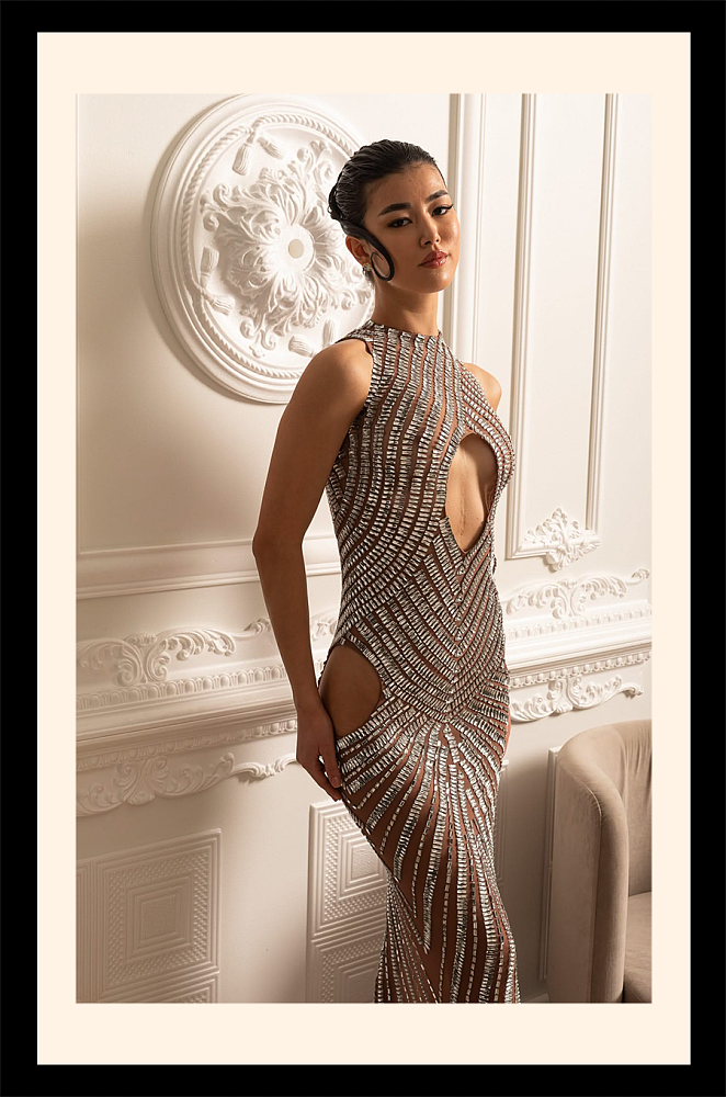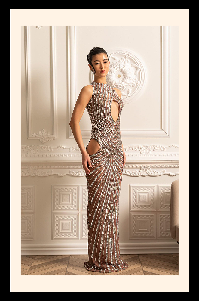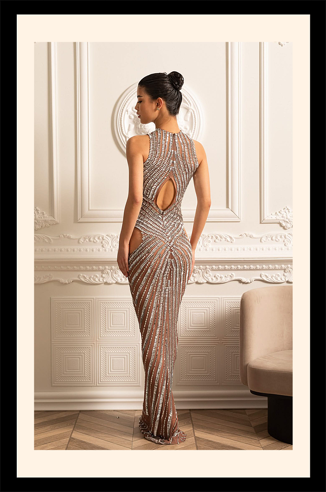 A magnetic interplay of light and shadow, the Couture Solstice Gown commands attention through its sculptural form and radiant precision. Hand-embellished with linear metallic crystals that trace the body’s natural curves, this masterpiece evokes both architectural strength and ethereal fluidity.