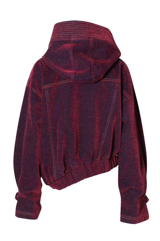 The Crimson Eclipse Jacket fuses urban edge with sculptural tailoring, crafted in a deep red-wine denim wash that shifts with light for a molten finish. Its cropped silhouette is cinched with an asymmetric elastic hemline, balancing structure and fluidity. A hooded neckline, utility-inspired zip pockets, and statement cuff straps add modern streetwear utility, while the bold color story makes it a standout layering piece. Designed for the woman who commands attention in motion—whether styled with leather trousers, couture skirts, or elevated denim.