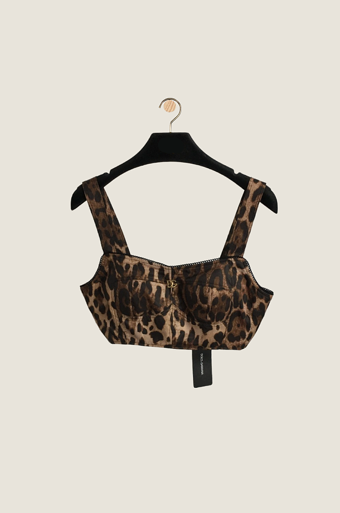 Designed in the brand’s iconic leopard print, this two-piece ensemble embodies modern Dolce allure: confident, unapologetic, and irresistibly feminine. Whether worn together for a full Dolce fantasy or styled separately for high-impact contrast, it’s a statement of empowered elegance.