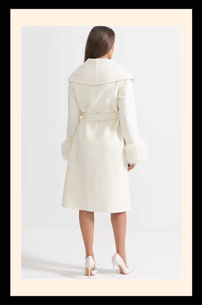 An ode to luminous sophistication. The Éclaire Blanche coat envelops the wearer in a world of refined grandeur, blending soft ivory wool with intricate hand-applied crystal embroidery that glimmers like frost under moonlight. Oversized faux-fur cuffs and a sculpted collar frame the silhouette with couture precision, while the self-tie waist belt cinches for a sculpted, regal finish. This statement piece captures the essence of Velour de Luxe — power draped in elegance, designed for evenings that demand quiet brilliance.