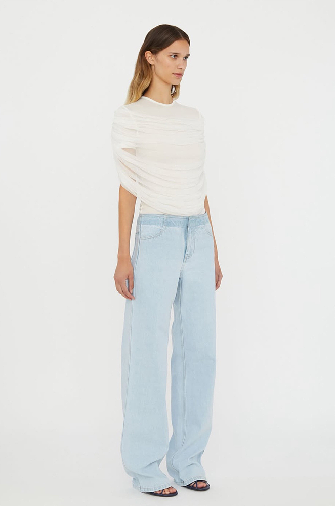 Sculpted in soft ivory mesh, this short-sleeved top is an effortless expression of understated luxury. The artful draped front design creates fluid dimension, delicately framing the silhouette while maintaining a weightless, airy finish. Ideal for layering beneath tailored blazers or pairing with high-waisted skirts and trousers, it bridges modern refinement with timeless femininity.