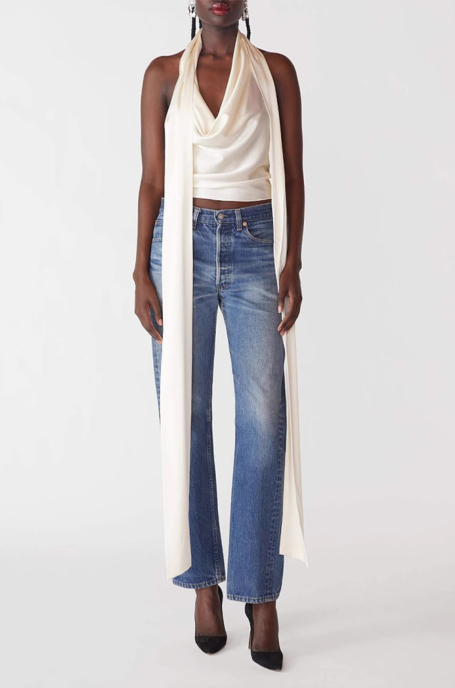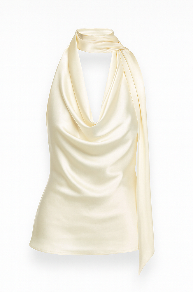 lluminate your wardrobe with the Étoile Blanche Satin Halter Top, a lustrous statement piece designed to radiate elegance. Cut from fluid satin in a pristine ivory hue, this halter silhouette features an elongated scarf tie that cascades dramatically, exuding both grace and movement. The sleek open-back design is framed with delicate strap details, balancing sophistication with allure.