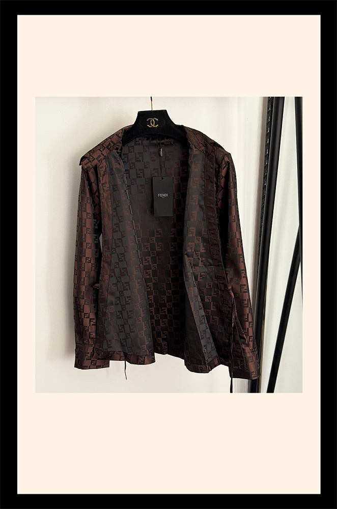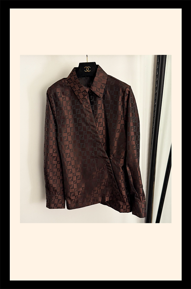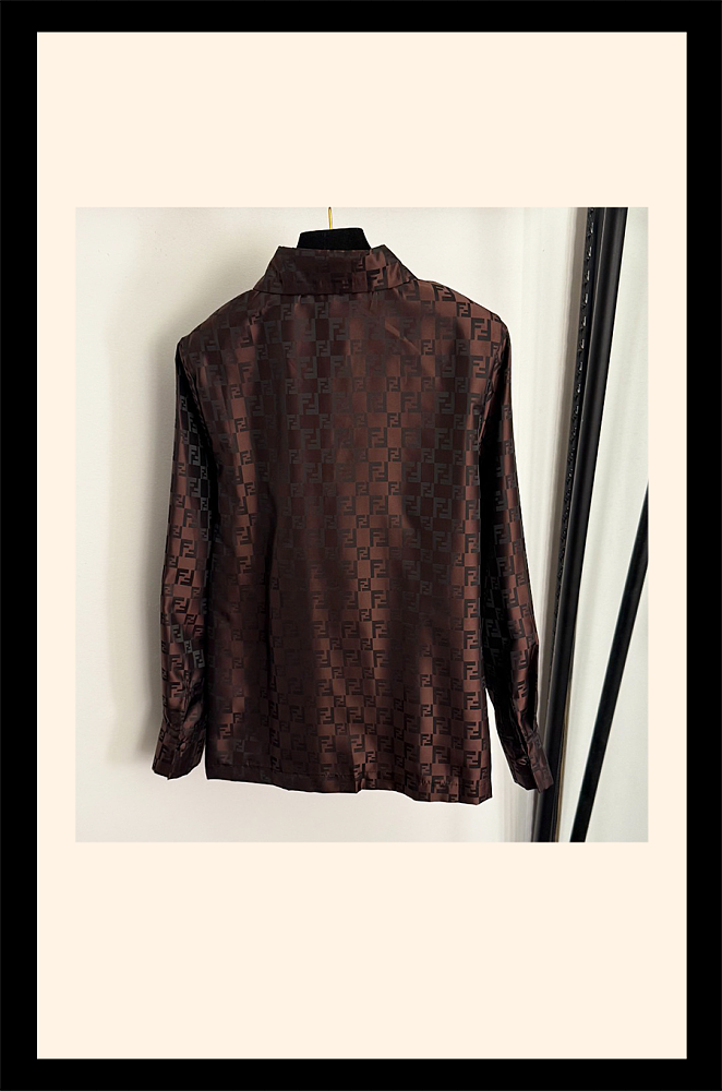 Elevate your wardrobe with this Fendi chocolate satin shirt, adorned with the house’s iconic FF monogram jacquard throughout. Designed in a fluid silhouette, this long-sleeve shirt features a sharp point collar and a lustrous finish that transitions seamlessly from day to evening. Pair it with the matching satin skirt for a full co-ord statement, or style it solo with tailored trousers or denim for refined everyday luxury.