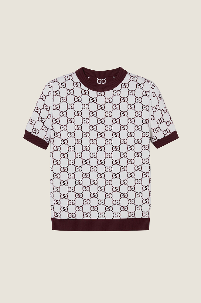 A refined expression of contemporary heritage, this short-sleeve knit top showcases the iconic GG monogram motif in a deep maroon and ivory palette. Crafted in a soft stretch-knit fabrication, it offers a flattering, close-fit silhouette accented with ribbed trims at the neck, cuffs, and hem. Perfect for styling with high-waisted trousers, pleated skirts, or a matching cardigan for an effortless statement of sophistication.
