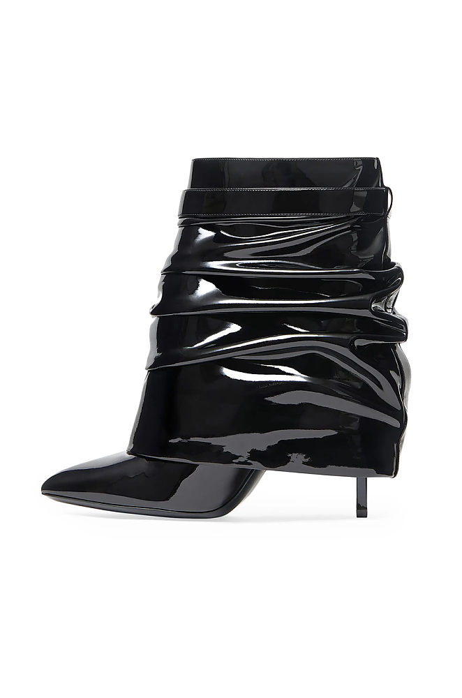 A bold fusion of modern glamour and architectural edge, the Givenchy Lock Ankle Boot is crafted in high-shine black patent leather with an artfully draped silhouette. The boot is adorned with the house’s statement-making 4G padlock hardware in polished gold, adding an instantly recognizable detail of Parisian luxury. Featuring a pointed toe and a sleek stiletto heel, this ankle boot is a powerful style statement — perfect for evenings, red carpet appearances, or elevating any look with couture attitude.