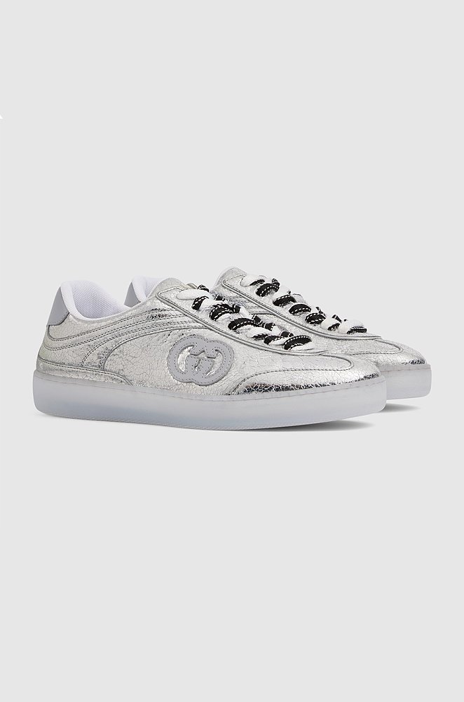 Futuristic shine meets Italian heritage in the Gucci “Argento Monogram” Metallic Low-Top Sneakers. Wrapped in a distressed silver leather finish, these statement sneakers deliver a mirror-bright gleam with a textured, artisanal crackle effect — giving them the luxury edge of runway styling.