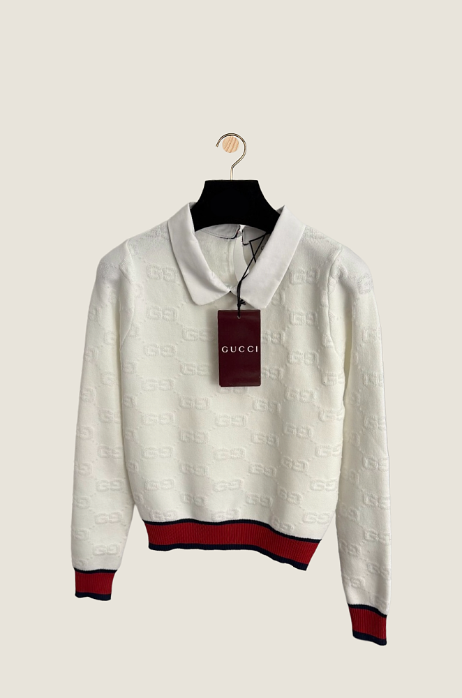 The crisp white polo collar adds a tailored touch, while the signature Gucci ribbed hem and cuffs in classic red and navy create a refined contrast inspired by the House’s equestrian heritage. Soft, cozy, and effortlessly chic, this sweater pairs flawlessly with trousers, skirts, and luxe denim for elevated styling year-round.