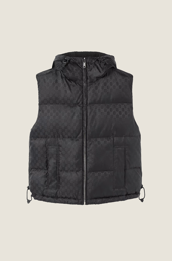 The Gucci Noir Monogram Puffer Vest is the embodiment of modern sophistication and effortless versatility. Designed in the maison’s tonal GG-embossed nylon, this piece fuses heritage design with sleek, utilitarian structure. The lustrous black-on-black monogram adds understated depth, while the detachable hood and refined silhouette ensure comfort without compromising on luxury. Perfect for layering over sweaters or under a trench, it bridges casual refinement with contemporary street couture.