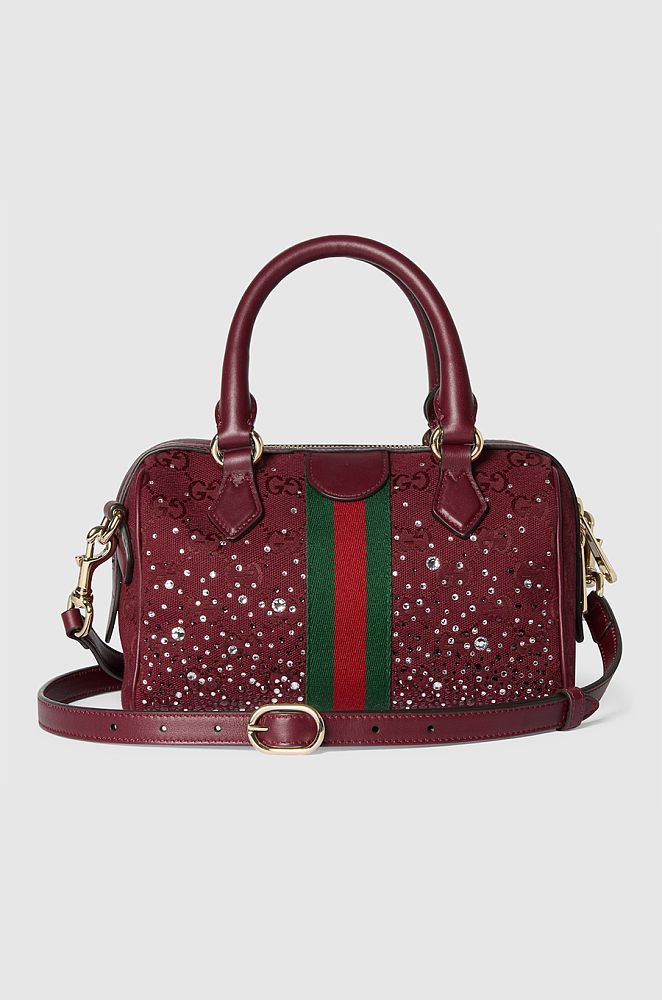 Heritage house codes meet jewel-studded glamour in the Gucci Ophidia Crystals Small Boston Bag. Designed in a deep garnet base, this compact Boston silhouette is fully adorned with a crystal-gradient formation that cascades from micro lights to brilliant faceted stones. Each crystal catches the light with diamond-like sparkle, creating a refined contrast against the iconic green-and-red Web panel.