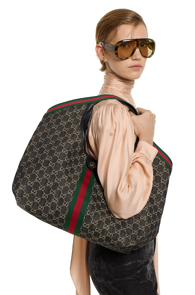 Defined by its deep structure and signature green-red web stripe, the design evokes a quiet confidence — equal parts sophistication and utility. The oversized curved cutout handles and spacious interior nod to vintage jet-set style while embracing contemporary functionality. Finished with the gold-tone Double G emblem, this piece is a statement in enduring luxury.