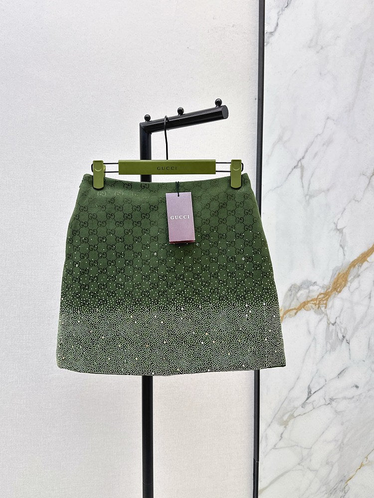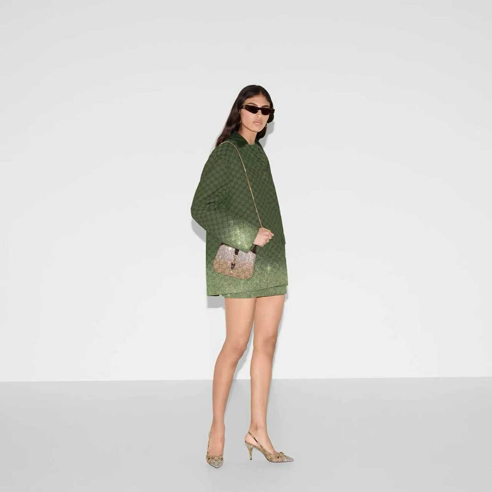 An ode to modern opulence, the Verde Opale Coat Set by Gucci redefines heritage with contemporary luminosity. Crafted in a deep jade hue, the signature GG monogram canvas is elevated with a gradient of glistening crystal embellishments that cascade from hem to collar. The relaxed, boxy coat silhouette layers effortlessly over the coordinating mini skirt, creating a statement of quiet glamour and sculpted modern femininity.