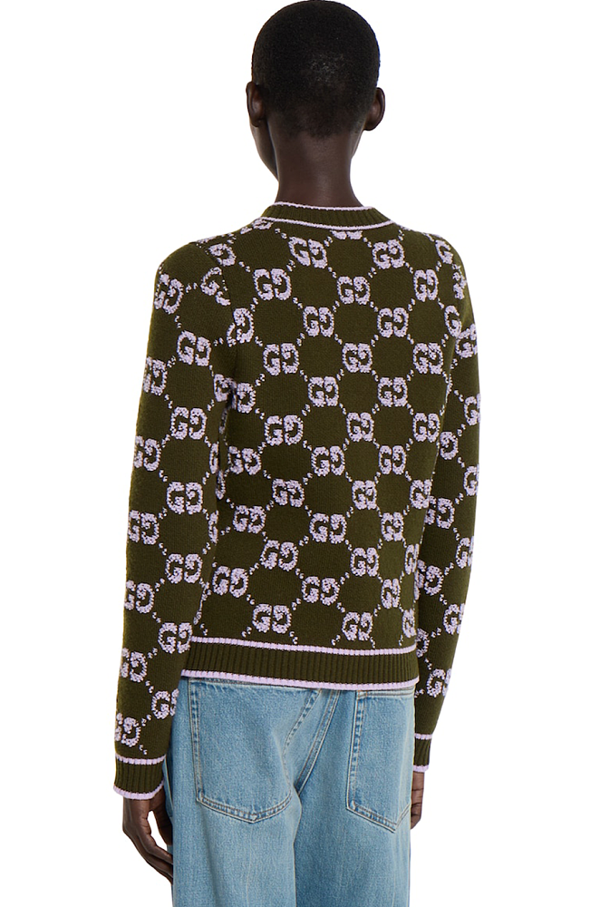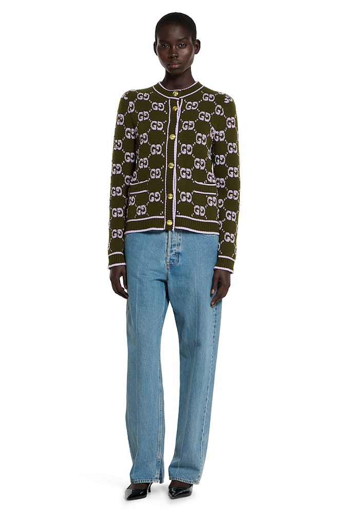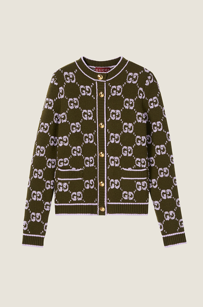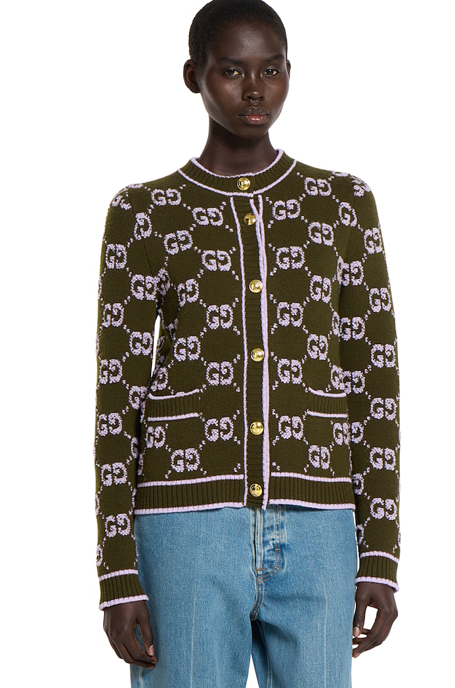 An exquisite expression of Gucci’s timeless codes, the Verona Maglia GG Knit Cardigan blends heritage craftsmanship with a modern, metropolitan edge. Crafted in Italy from a soft cotton-blend knit, this piece features the iconic interlocking GG motif in lilac against an olive backdrop—an elegant play on contrast and texture that embodies understated opulence.