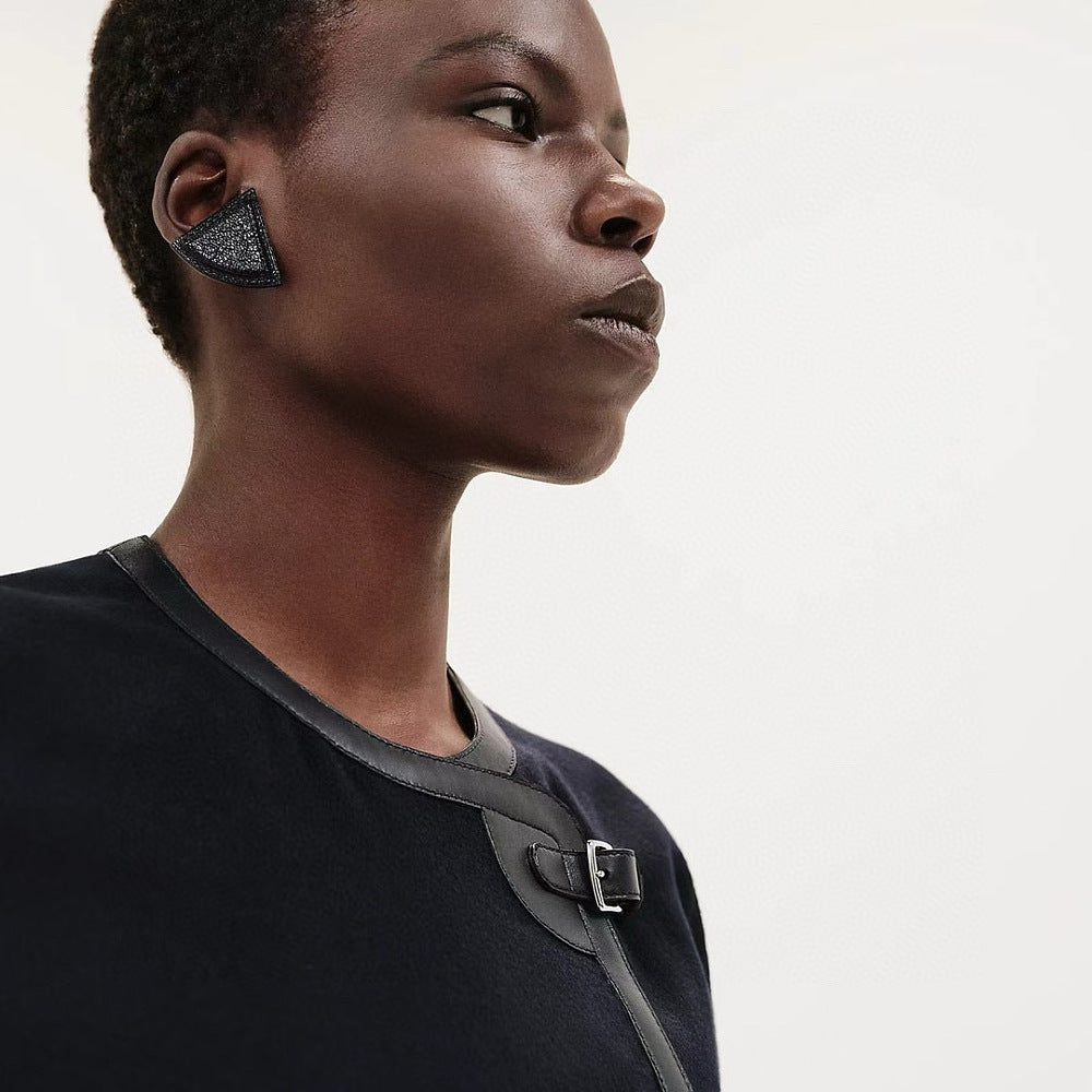 A study in architectural minimalism, the Hermès Éclipse Structurée Jacket embodies the maison’s mastery of subtle power dressing. Crafted from the finest black wool, its clean silhouette is elevated with tonal calfskin leather trim along the collar and an asymmetric front closure—fastened with a discreet buckle detail. Textured grid-panel pockets introduce a graphic modernity, balancing timeless refinement with contemporary edge.