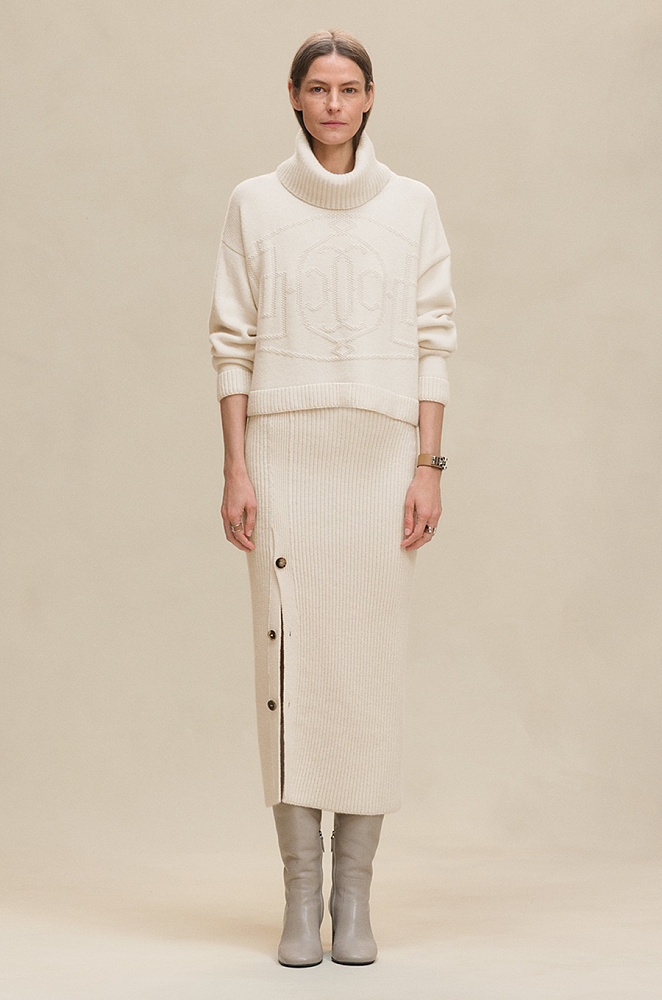 • Two-piece wool-cashmere knit set: turtleneck sweater + ribbed button midi skirt
