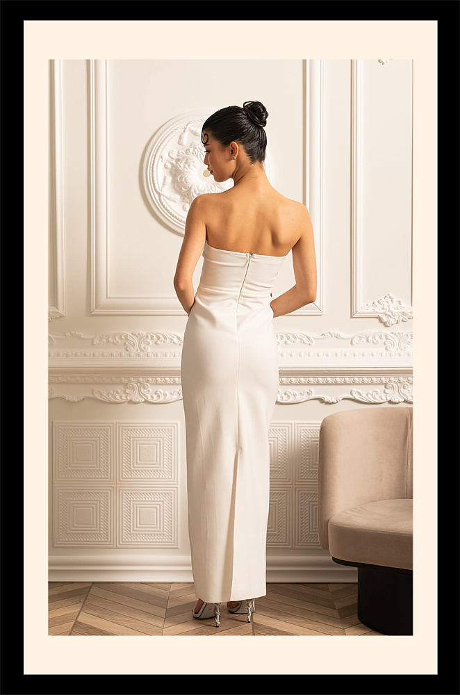 Pair with crystal-adorned heels and sleek drop earrings to heighten its sculptural luminosity. Perfect for red carpet soirées, couture galas, or luxury evening receptions where elegance commands the room.