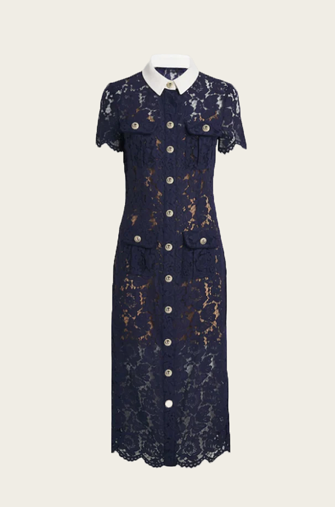 The “Madame Violette” Lace Midi Dress is an ode to refined grace — timeless, deliberate, and quietly commanding. Crafted in deep navy lace with a structured silhouette, its pearl-gold buttons and crisp ivory collar balance romantic femininity with tailored precision. A piece that transcends trends, Madame Violette channels the allure of Parisian power dressing — where elegance is the language, and confidence is the tone.