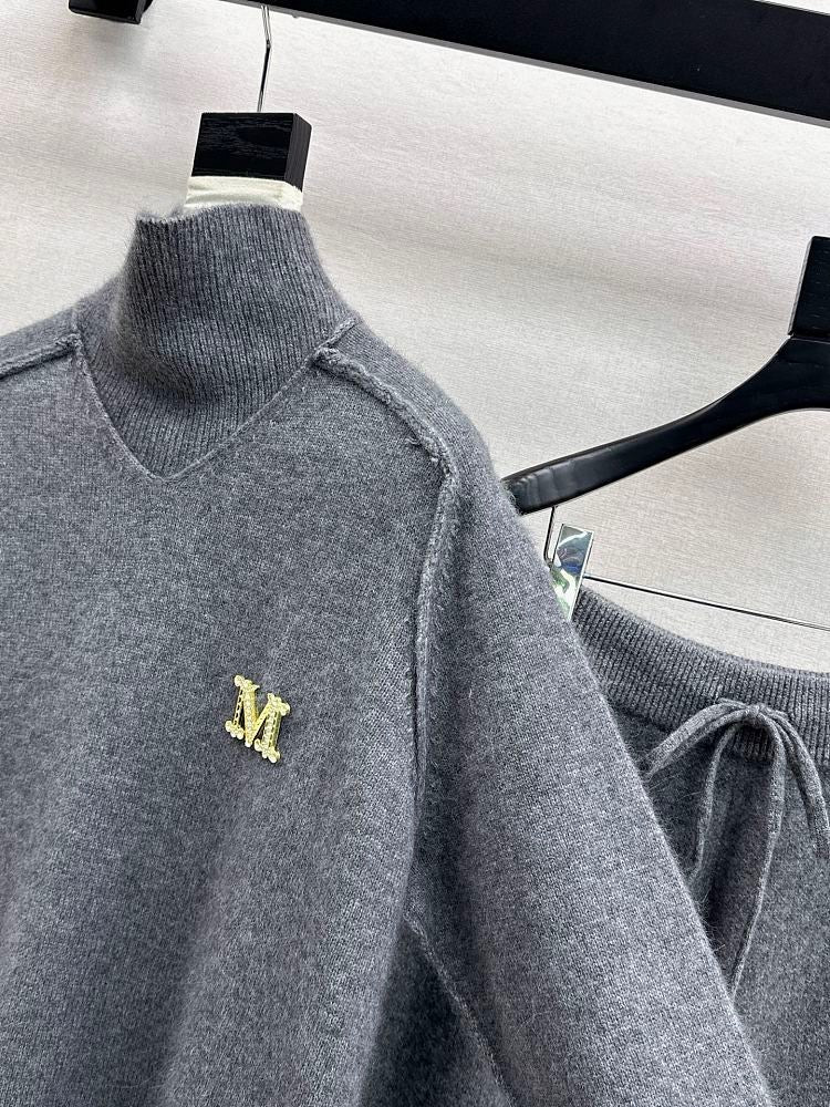 A study in understated elegance, the Max Mara Luxe Knit Lounge Set captures the brand’s signature quiet luxury—where refinement meets comfort. The soft cashmere-blend knit caresses the skin while maintaining structure and shape. The turtleneck sweater features a subtle V-seam neckline and the signature embellished “M” crest, complemented by coordinating wide-leg drawstring trousers that flow effortlessly with every movement.