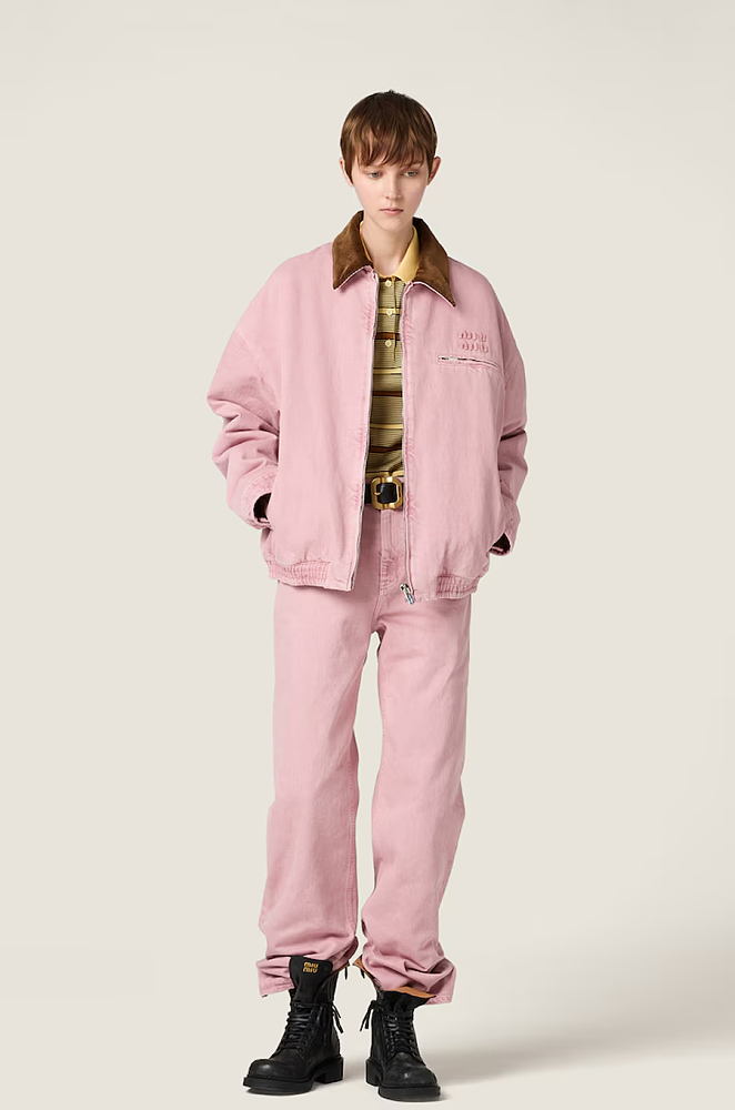 Infused with retro charm and modern ease, the Miu Miu Rosa Bomber offers an effortlessly chic layer for transitional weather. Crafted in a soft blush-pink cotton canvas, the jacket is accented with a contrasting chestnut corduroy collar for a touch of vintage refinement. The embroidered Miu Miu logo and zip chest pocket add subtle detail, while the elasticized hem ensures a relaxed yet flattering silhouette. Pair it with tailored trousers or a pleated skirt for a playful twist on everyday elegance.