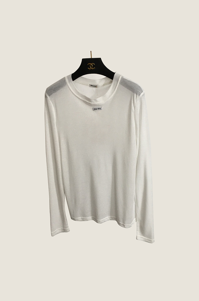 A timeless layering essential, the Miu Miu sheer signature long-sleeve top redefines understated chic. Crafted from lightweight, semi-sheer knit, it offers a sleek second-skin fit perfect for both casual styling and elevated layering. The subtle Miu Miu logo tab detail at the neckline provides a signature touch of refinement. Available in classic white for a fresh minimal aesthetic or black for a sultry, versatile edge, this piece transitions effortlessly from day to night.