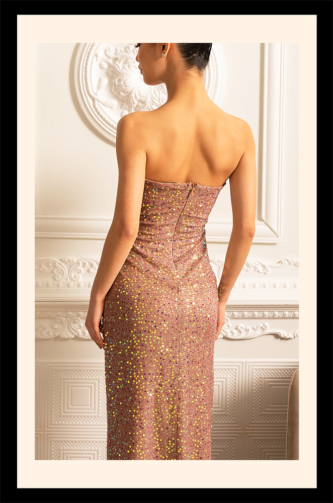 The Opéra de Rose Beaded Illusion Gown is a masterstroke of refined seduction, evoking the romance of Parisian evenings and the brilliance of couture craftsmanship. Draped in soft rose sequins that shimmer with prismatic radiance, this gown sculpts the silhouette with meticulous ruching that enhances every curve.