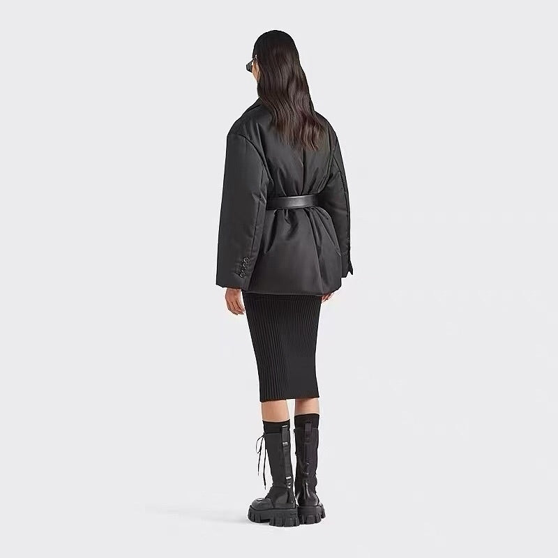 The design features strong, architectural shoulders, a double-breasted silhouette, and exaggerated utility pockets for a bold yet feminine structure. A cinched belt defines the waist, balancing the voluminous padding with sophisticated contouring. Finished with the iconic enameled triangle logo, this piece captures the duality of strength and softness — the very essence of modern Prada.