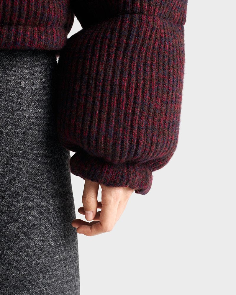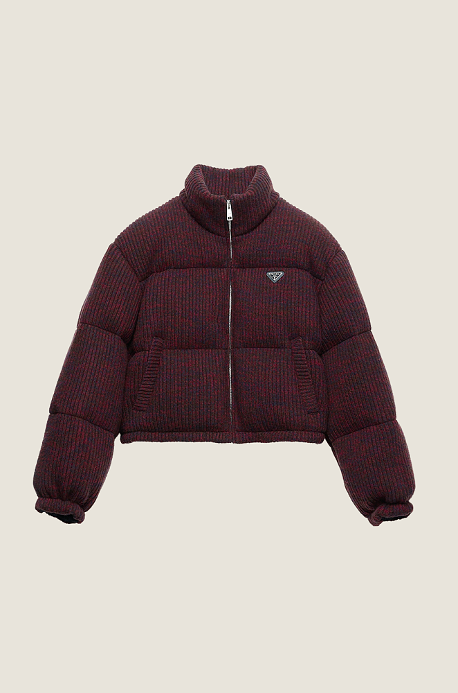 An emblem of understated power and precision, the Prada Cordura Luxe Puffer Jacket redefines cold-weather couture. Crafted from a richly textured ribbed knit in a deep merlot and noir blend, this voluminous cropped silhouette balances architectural structure with modern minimalism. The iconic enameled Prada triangle logo at the chest speaks quietly yet commandingly to the brand’s heritage of innovation and refinement.