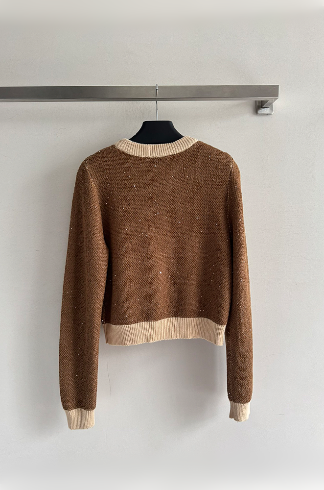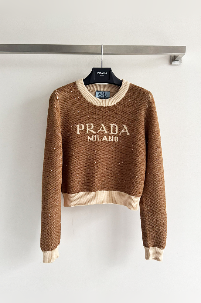 The Prada Milano Crystal Knit Logo Sweater radiates understated luxury with a feminine, modern touch. Woven in a soft textured knit and subtly infused with glimmering crystal accents, this cropped silhouette reimagines casual elegance through the lens of Prada’s signature refinement. Featuring contrast ribbed trim at the neckline, cuffs, and hem, and finished with the Prada Milano logo embroidery across the chest — it’s both polished and playfully effortless. Pair it with tailored trousers, pleated skirts, or denim for a chic off-duty statement.