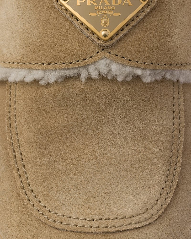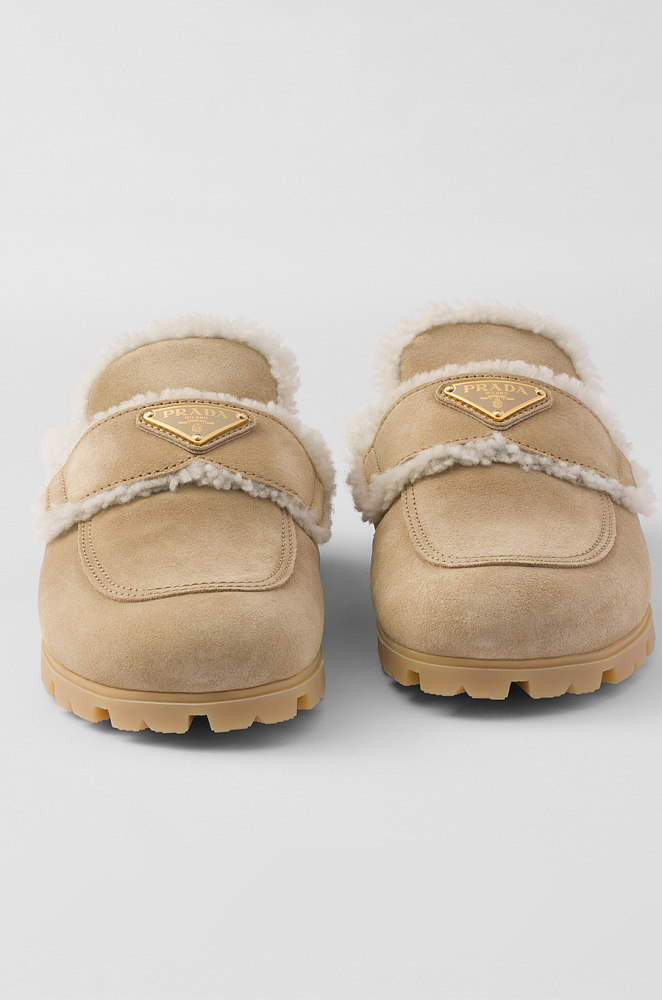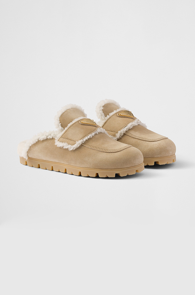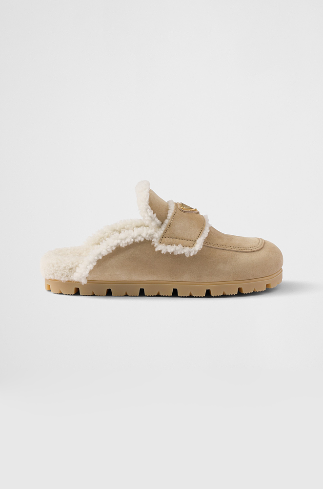 Prada Shearling-Lined Suede Mules – Camel Beige