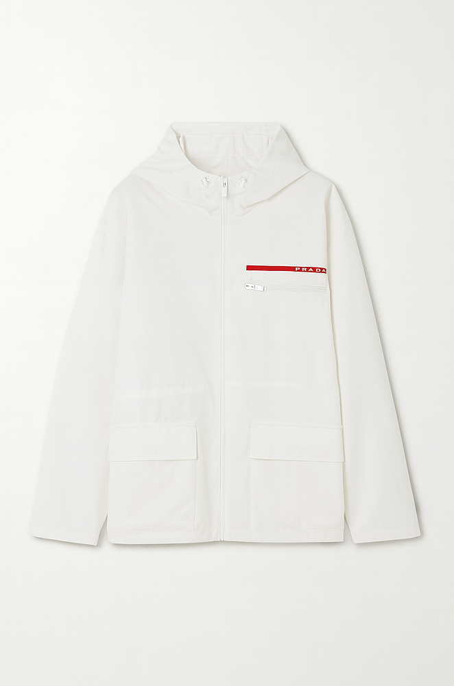 Prada redefines sporty minimalism with this sleek white hooded jacket, crafted from lightweight technical fabric that embodies the brand’s signature blend of function and luxury. Clean lines are punctuated by the iconic red Prada logo stripe at the chest, adding a bold yet refined accent. Designed for versatility, this jacket is equally at home layered over casual city looks or as a polished travel essential.