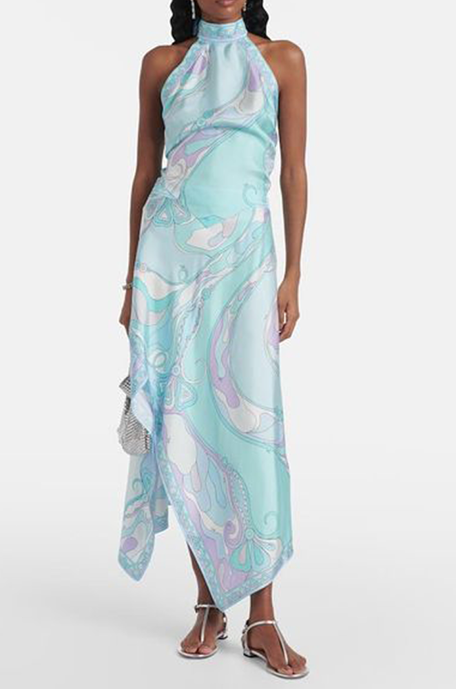 Dive into a dreamscape of color with the Pucci Aqua Mirage Set, a two-piece ensemble designed to embody the fluidity of ocean waves and the elegance of summer evenings. The halter top features a sculpted high neckline with back tie detailing, offering an alluring open-back silhouette. Paired with the asymmetrical midi skirt, draped in Pucci’s signature swirls of aqua, lilac, and ivory, the set exudes effortless sophistication with a playful edge. Lightweight silk fabrication ensures a soft, fluid movement with every step, making it an ideal choice for resort escapes, sunset soirées, or luxury city strolls.