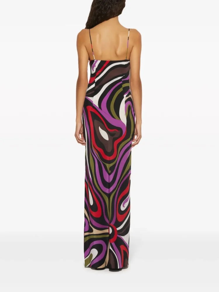 Exuding effortless sensuality, this Pucci silk slip gown captures the maison’s signature 1970s allure with a modern silhouette. Draped in fluid silk satin, the design is brought to life through bold swirling waves of violet, crimson red, olive green, and noir, creating an entrancing psychedelic effect. The slender spaghetti straps, low back, and elongated silhouette evoke an understated elegance that transitions seamlessly from sunset cocktails to late-night soirées.
