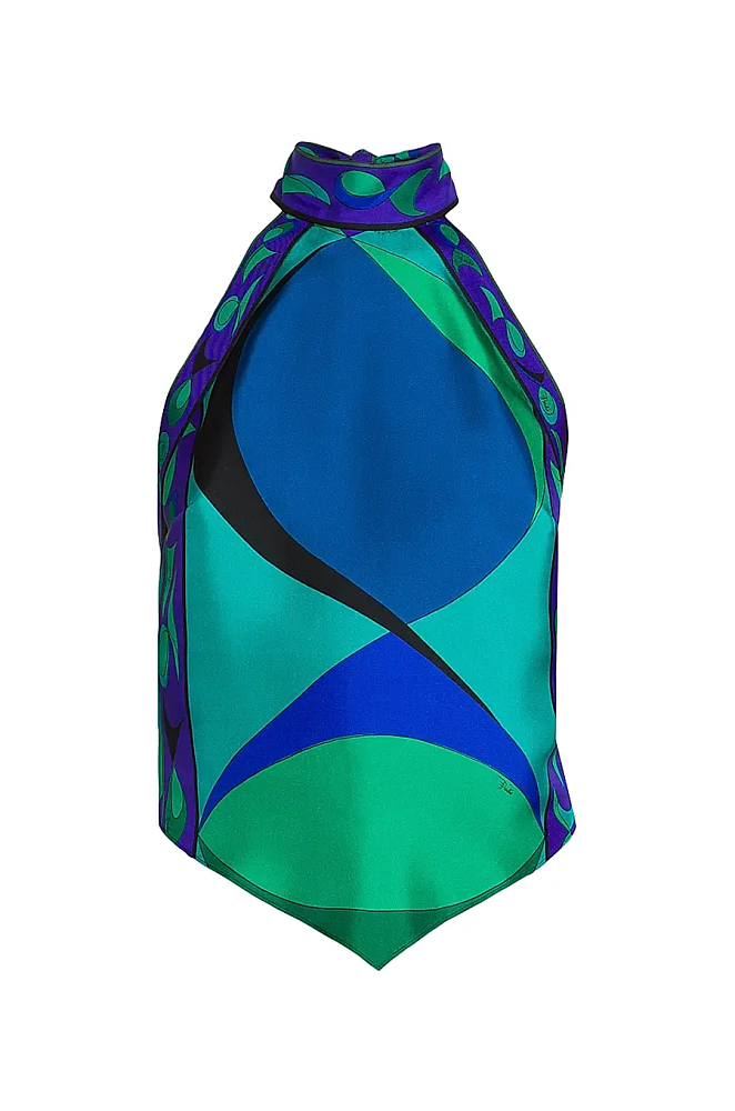 Dive into a world of fluid elegance with the Pucci Oceana Verde Halter Top & Skirt Set. Designed in the house’s signature kaleidoscopic swirl, this ensemble balances vibrant emerald, cobalt blue, deep violet, and jet-black accents in a hypnotic print. The halter top features a scarf-inspired neckline with back bow ties, offering both sensuality and ease, while the asymmetric handkerchief hem skirt flows gracefully with every step. The lightweight silk fabric makes this set the perfect companion for both resort evenings and modern city styling.