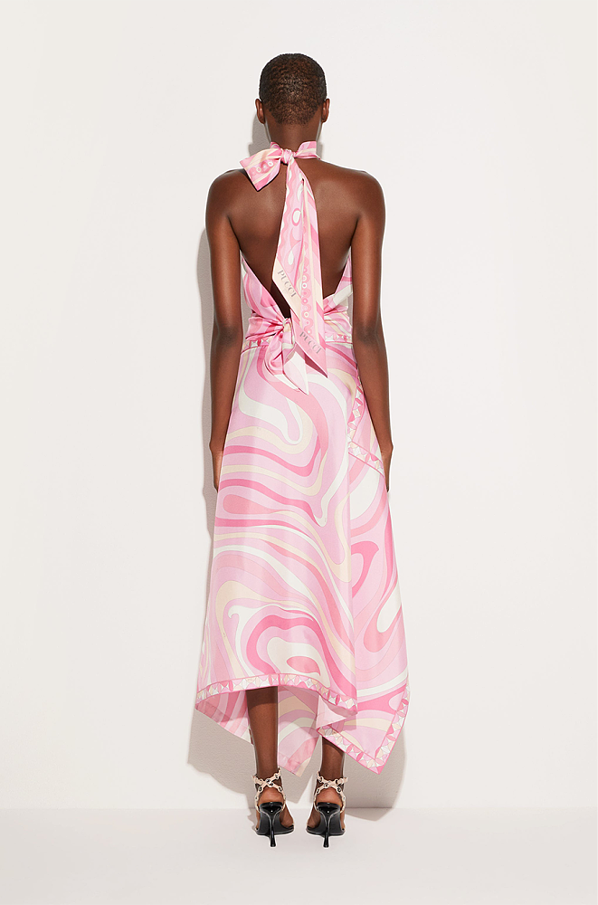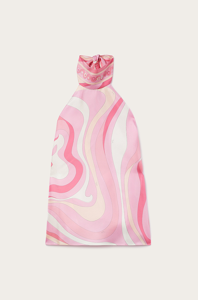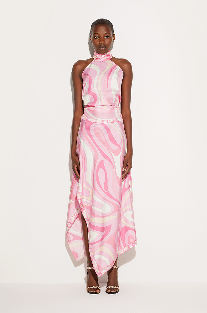 A vibrant celebration of Pucci’s archival swirls, this two-piece set radiates bold femininity. The halter top ties gracefully at the neck and back, revealing a striking open back, while the matching asymmetric skirt drapes with fluid movement. Crafted in lustrous silk satin, the print in blush, rose, and ivory exudes effortless sophistication. Perfect for elevated resort evenings or modern cocktail styling.