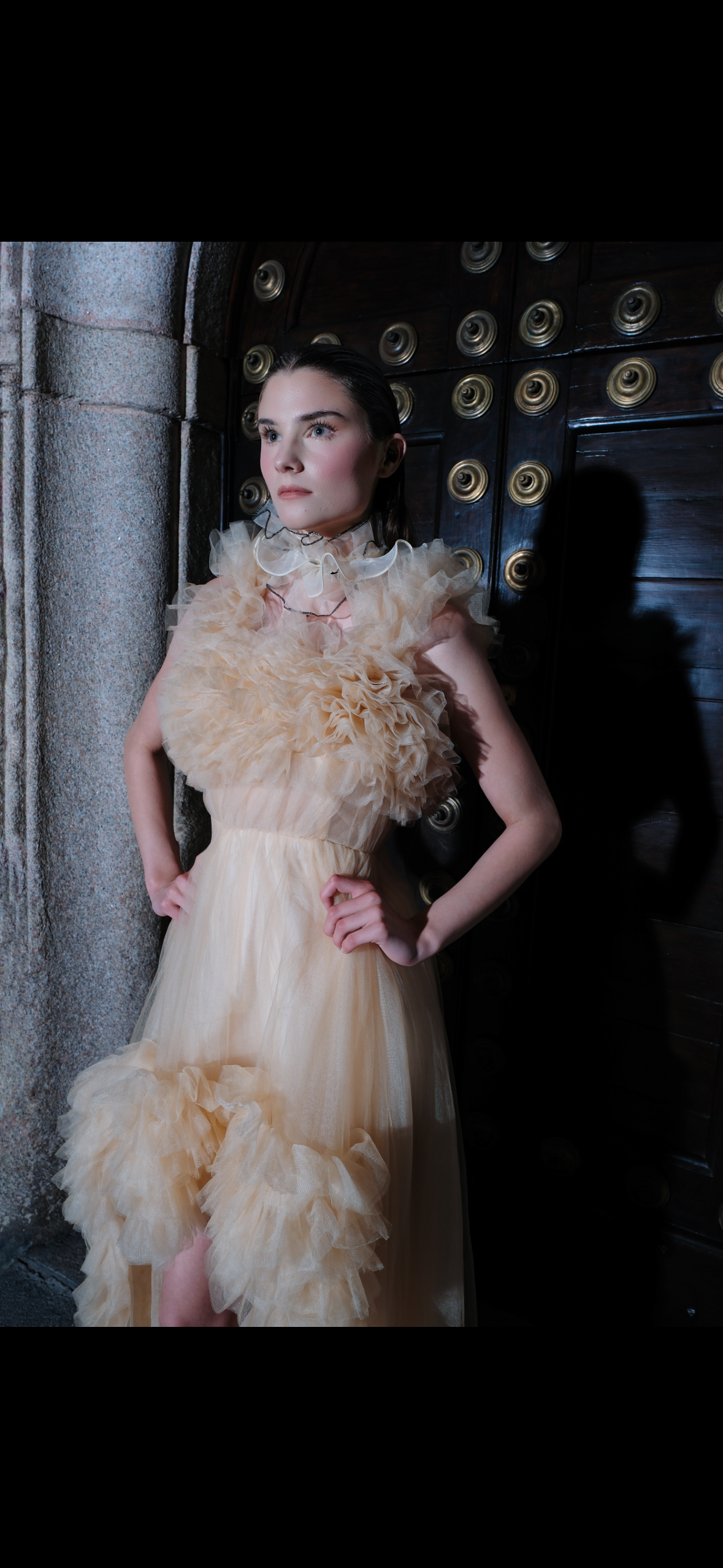 The softly gathered neckline rises into a subtle couture collar, framing the face with delicate transparency and adding a refined dimension to the garment’s romantic structure.