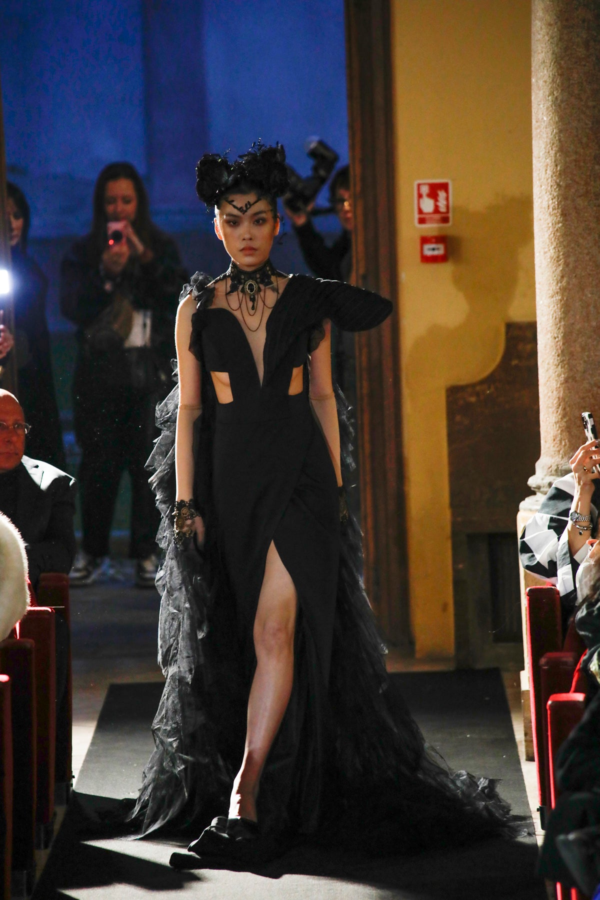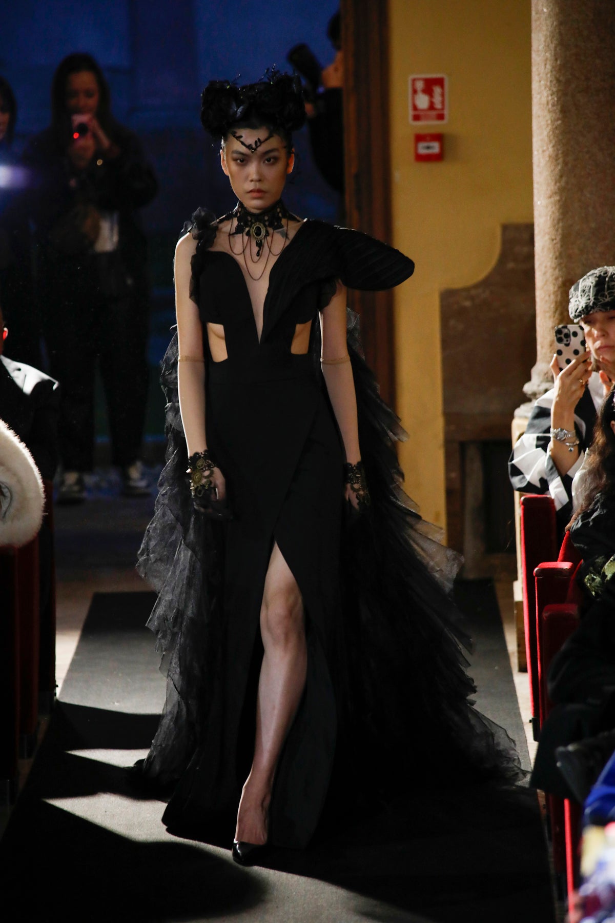 Part of the Puissance Sculptée Haute Couture FW27 collection, presented during the Luxe Living Fashions Milan showing. The design reflects the maison’s exploration of architectural silhouettes, shadowed elegance, and dramatic couture structure.