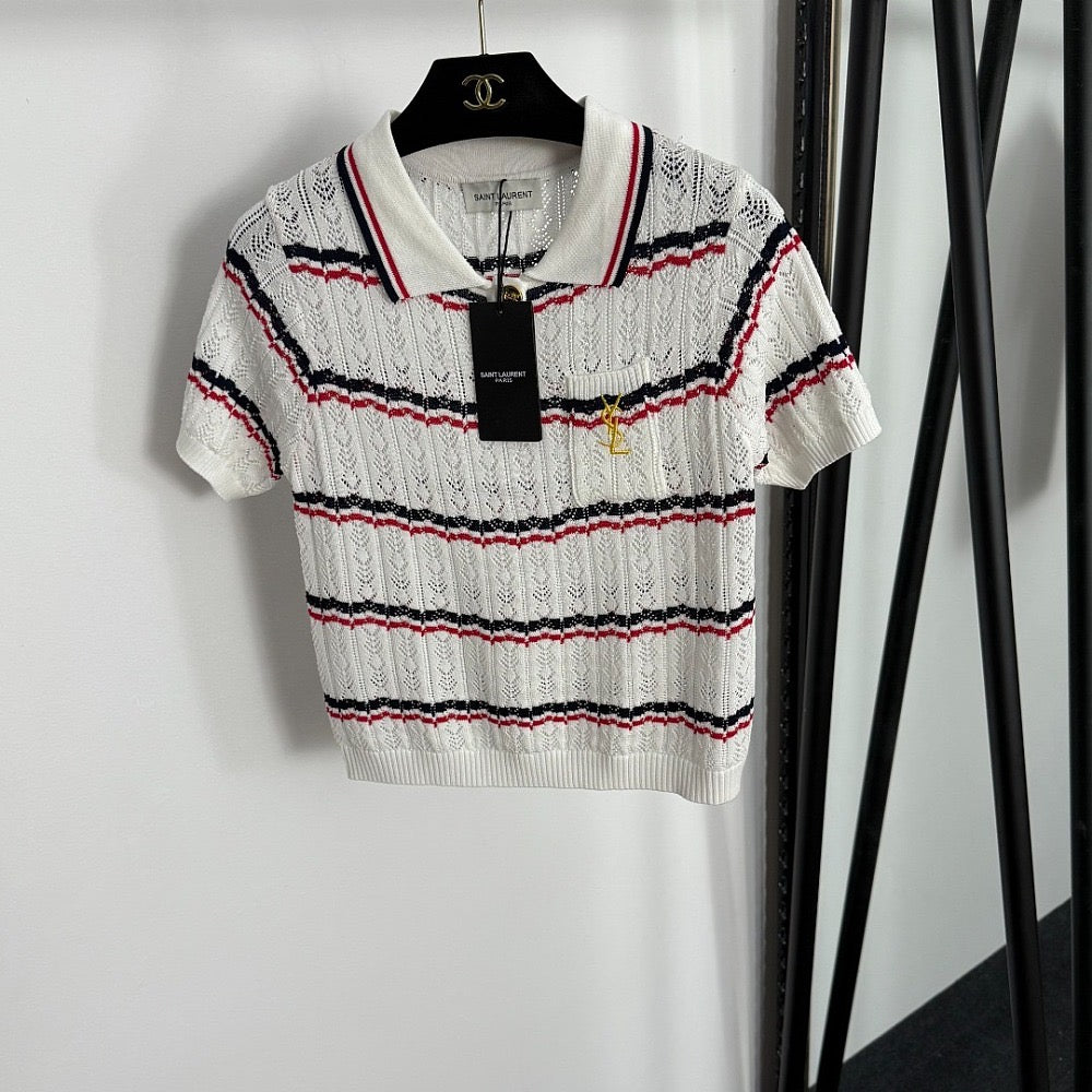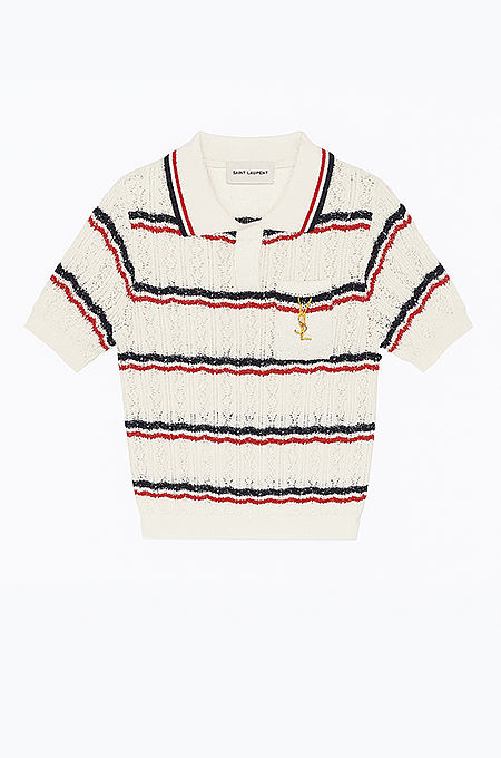 An iconic blend of French prep and romantic edge, this Saint Laurent short-sleeve polo top makes a polished statement with its intricate lace-knit texture and tricolor stripe motif. Crafted in soft ivory with accents of navy and red, it features a structured ribbed collar, gold YSL monogram embroidery at the chest, and a delicate button placket adorned with engraved signature buttons. It’s a refined nod to vintage sportswear with Parisian sophistication.