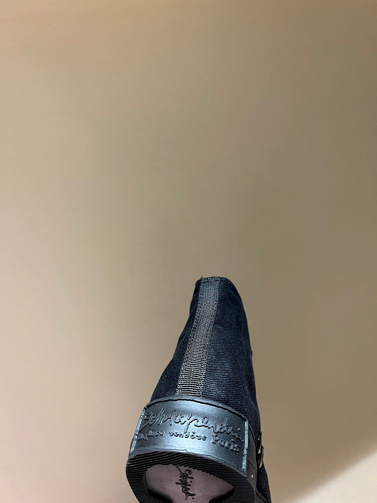 The bold anatomical toe detail contrasts against a classic high-top silhouette, while metallic eyelets and structured soles underscore Schiaparelli’s fearless approach to blending couture artistry with urban sensibility. A true statement piece, these sneakers redefine streetwear with unapologetic extravagance.