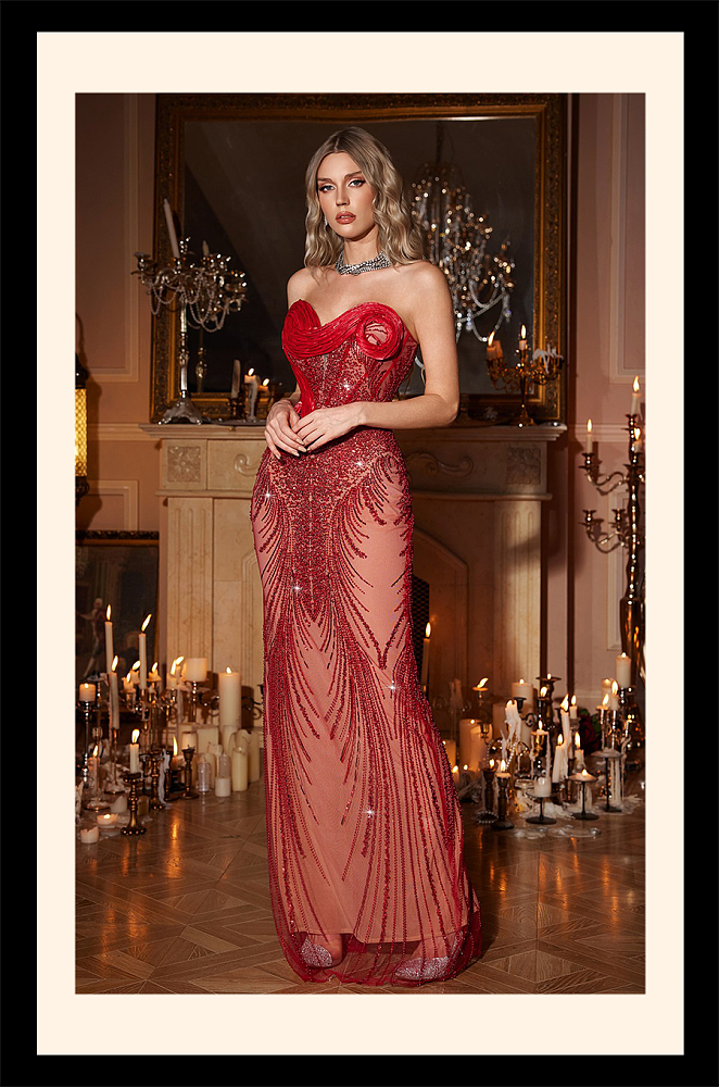 Every bead tells a story of devotion and desire — tracing the body’s natural rhythm with an artistry that feels both regal and forbidden. The illusion skirt creates an ethereal light play that moves like flame, while the strapless neckline defines the wearer’s presence with cinematic grandeur.