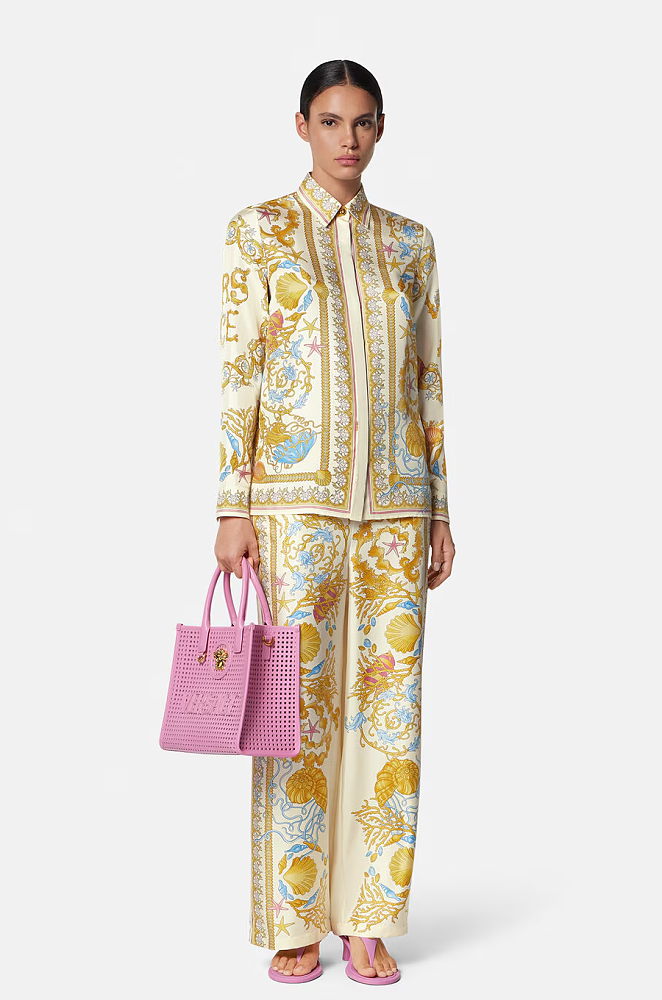 This Versace Barocco Mare Silk Pajama Set brings the house’s iconic Mediterranean-inspired artistry to loungewear and resort chic. Crafted from lustrous silk, the long-sleeve button-down shirt is tailored in a relaxed pajama silhouette, adorned with seashell, coral, and baroque motifs in rich gold, aqua blue, and coral pink. Coordinating wide-leg trousers complete the set, offering a flowing drape with elasticized comfort at the waist. Designed for both indulgent relaxation and elevated styling, this ensemble embodies Versace’s coastal glamour reimagined for modern luxury living.