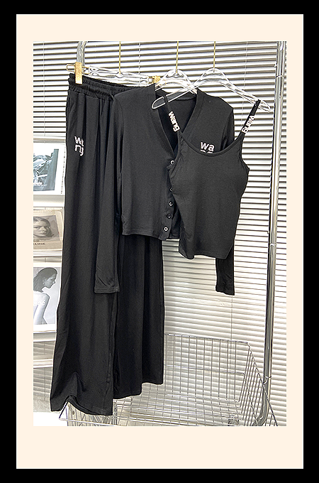 A statement in sleek minimalism, this Wang-inspired three-piece set redefines everyday comfort with a polished, high-fashion edge. The ensemble includes fluid wide-leg drawstring trousers, a cropped camisole with logo strap detailing, and a lightweight button-front cardigan — designed to be worn together for a coordinated look or styled separately for endless versatility. Crafted in jet-black with crystal logo accents, this set transitions seamlessly from off-duty lounging to elevated streetwear chic.