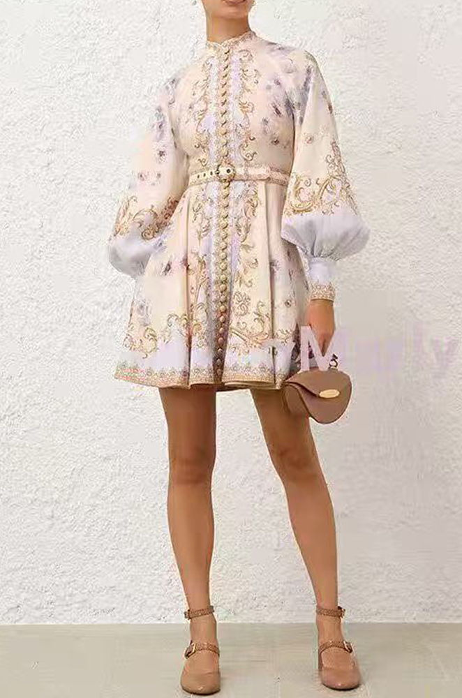 The Zimmermann Belle d’Or Baroque Mini Dress channels the ethereal romance of the maison’s signature craftsmanship. Designed in a soft pastel floral palette with intricate gold baroque detailing, this piece blends Renaissance opulence with modern femininity. The high neckline, voluminous bishop sleeves, and belted waist sculpt a refined silhouette that flatters every frame. With delicate button detailing and a flared skirt that moves with poetic grace, this dress is a timeless statement of artful luxury and sophistication.
