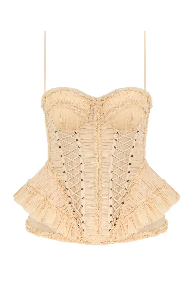 A sculptural expression of modern romance, the Zimmermann Écru Héritage Lace-Up Corset Top is crafted in a soft ivory hue with finely pleated fabrication and couture-inspired detailing. Featuring a structured sweetheart bodice, delicate lace-up corsetry, and a subtle peplum hem, this piece defines the waist while creating an elegant, feminine silhouette. Light, architectural, and exquisitely constructed, it embodies Zimmermann’s signature balance of strength and softness—ideal for elevated daywear or refined evening styling.